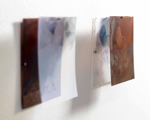 The negatives are displayed with their corresponding positives printed onto transparency paper.